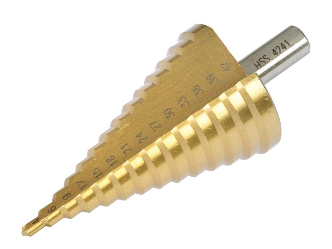 The BlueSpot HSS Step Drill is manufactured from high-speed steel for increased durability and cutting power. With 14 Steps: 2mm (4-6mm) and 3mm (9-42mm) increments. Titanium coated to reduce friction and heat.