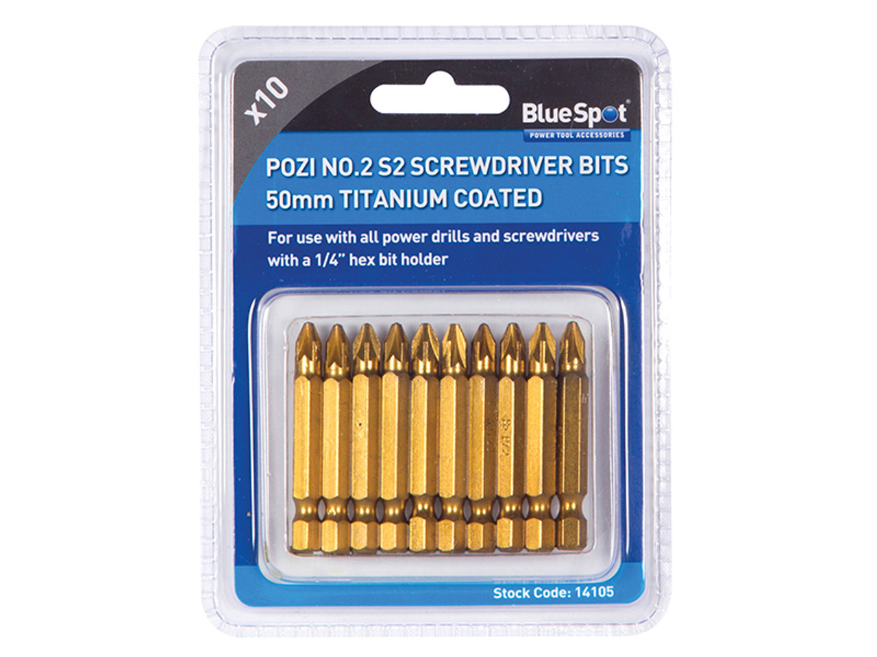 The BlueSpot Tools Titanium Coated Pozi Screwdriver Bits are manufactured from high-quality S2 steel with a titanium nitride coating for long lasting durability. Suited to high resistant materials including hard wood, metal, plastic and drywall. For use with all power drills, cordless drills and screwdrivers with a 1/4in hex bit holder.