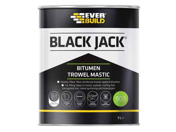 Everbuild Black Jack® 903 Bitumen Trowel Mastic is a black, heavily filled, bituminous compound with added fibres for reinforcement, that is applied by trowel. It is used primarily for patching holes in roofs and bituminous coatings. The product forms a surface skin, but the mass below remains soft to allow for moderate movement.