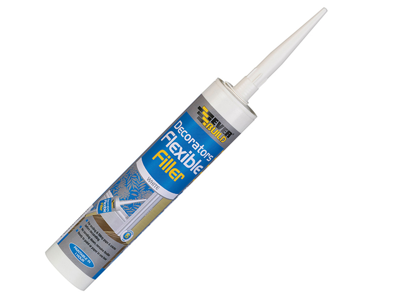 The Everbuild EVBFLEXWH Flexible Decorator's Filler is a fast drying, acrylic based filler and sealant that remains permanently flexible. Can be overpainted with most paint types or covered over with wallpaper. No sanding down is required.