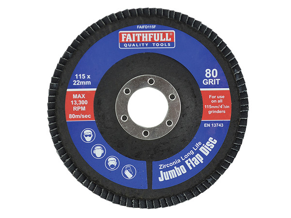 Faithfull Abrasive Jumbo Flap Discs contain up to 40% more abrasive than standard flap discs, providing a considerably longer working life. Manufactured from long lasting Zirconia Alumina. Resin bonded for extra strength and durability.