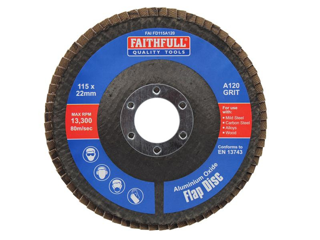 This Faithfull 120 Grit Aluminium Oxide Flap Disc is suitable for smooth grinding of mild steel, carbon steel and alloys.
