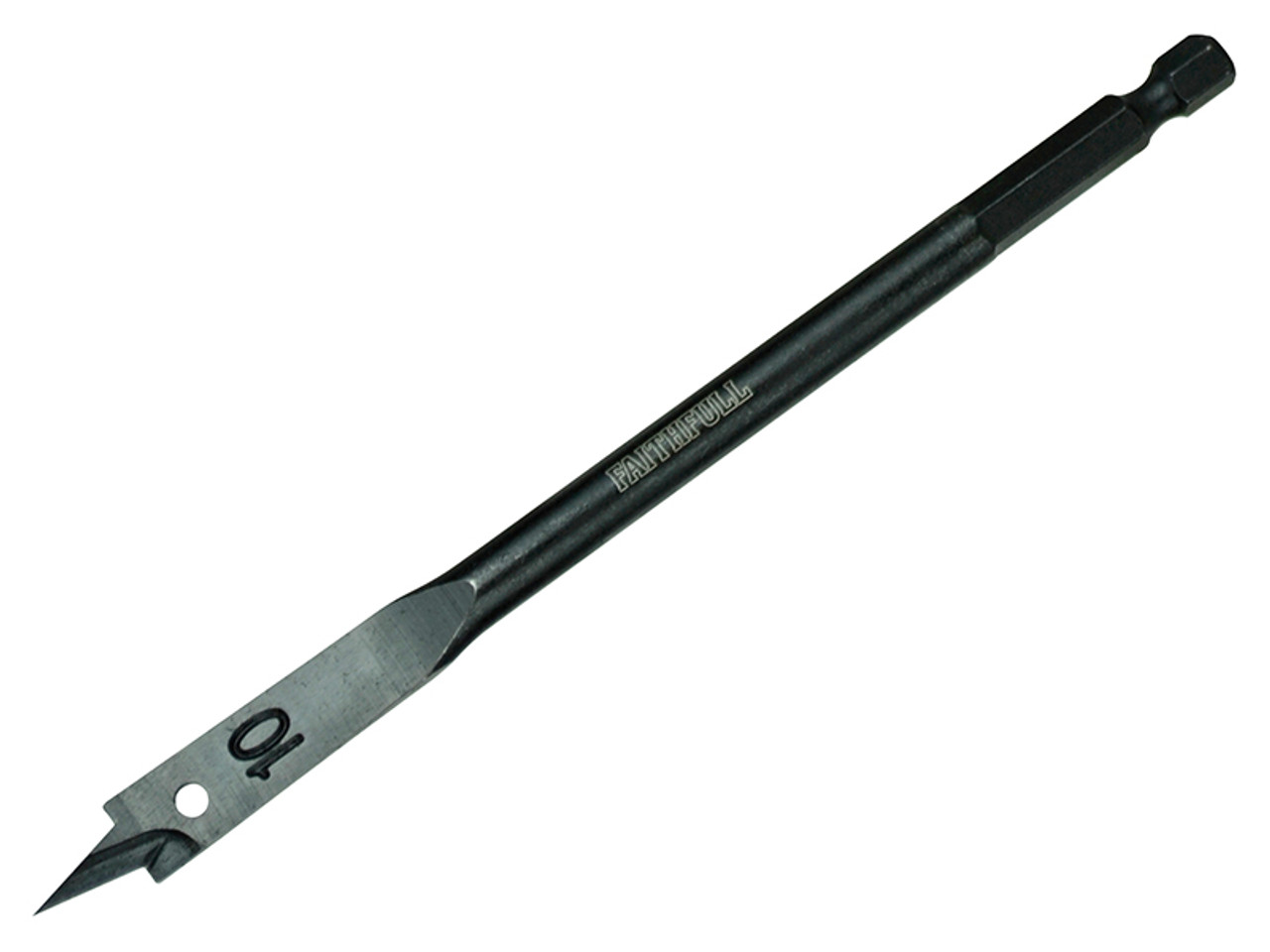 Faithfull Impact Rated Flat Bits are designed to perform fast, clean cuts, will bore all types of timber and are equally efficient when drilling with or against the grain. All bits have a precision ground point and cutting surfaces with extended spurs for faster cutting. All sizes except the 6mm, have a non-slip hexagonal shank with a locking mechanism compatible with adaptors or chucks with a built-in quick-release feature. A 300mm extension shank is available for use with flat bits of 16mm and above, for deep drill applications. Ideal for use with both mains or cordless drills.