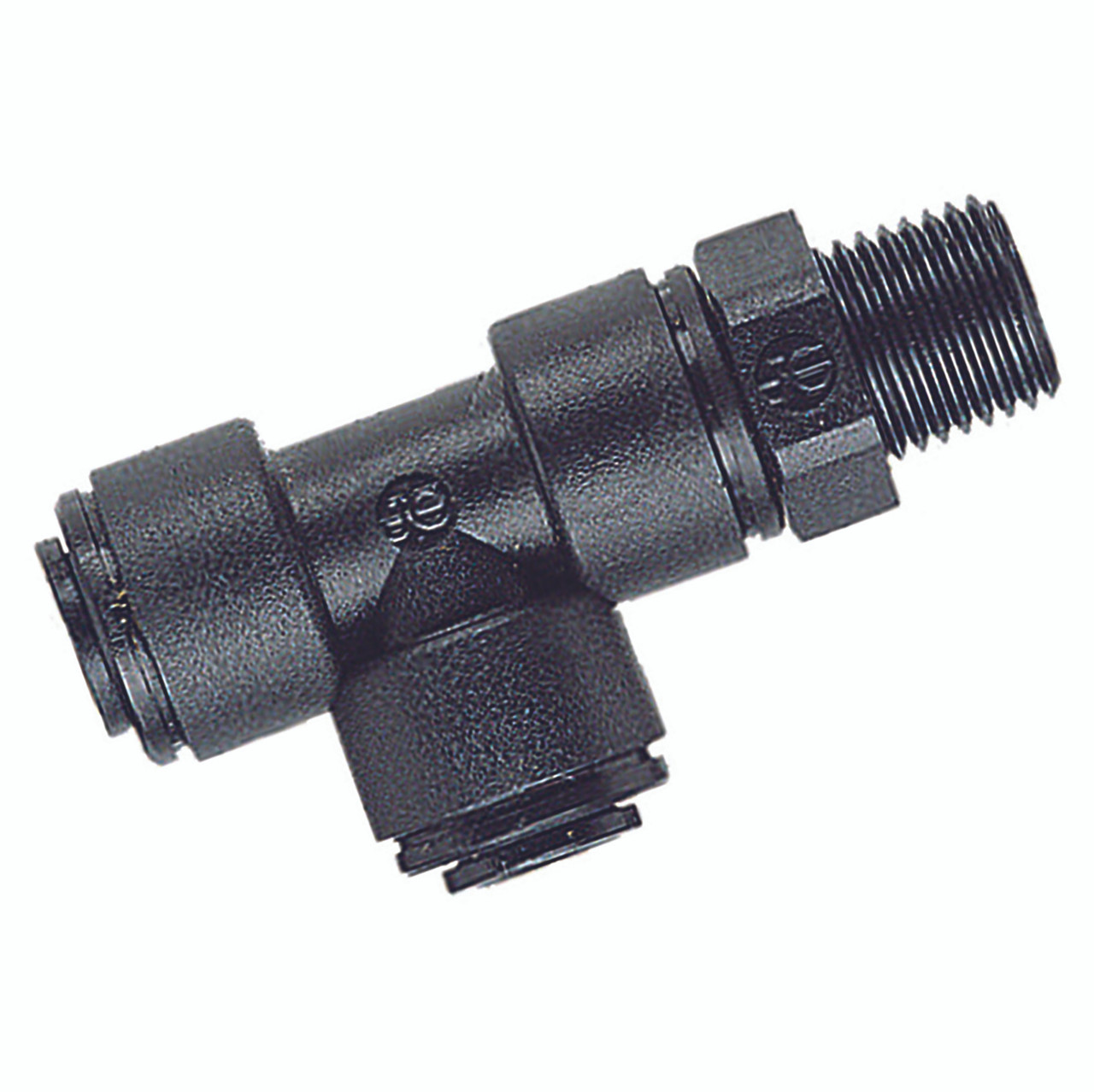 1/2" BSP Taper Male x 12mm Outside Diameter, Metric Push-in Fitting, Stud Run Tee (Offset Leg), Plastic, Working Temperature 0°C to +23°C, Maximum Working Pressure 10 bar, John Guest