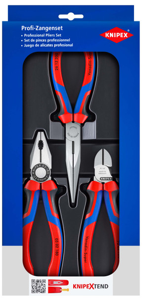 Attractive sales packaging with Euro standard perforation. Tools in a plastic deep-drawn tray with transparent lid. Dimensions (W x H x D): 170 x 370 x 40 mm. With comfort handles: consisting of three ergonomic components for optimized handling and equipped with two KNIPEXtend interfaces for extensions.