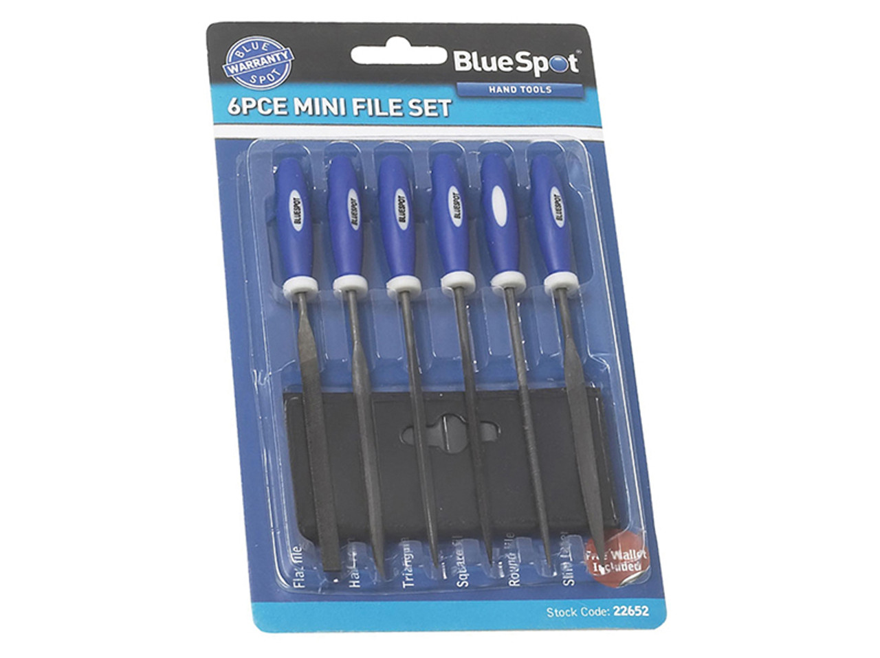 This 6-piece BlueSpot Tools Mini File Set contains: 1 x flat file, 1 x half-round file, 1 x triangular file, 1 x square file, 1 x round file and 1 x slim taper file. Supplied with a pouch for storage.