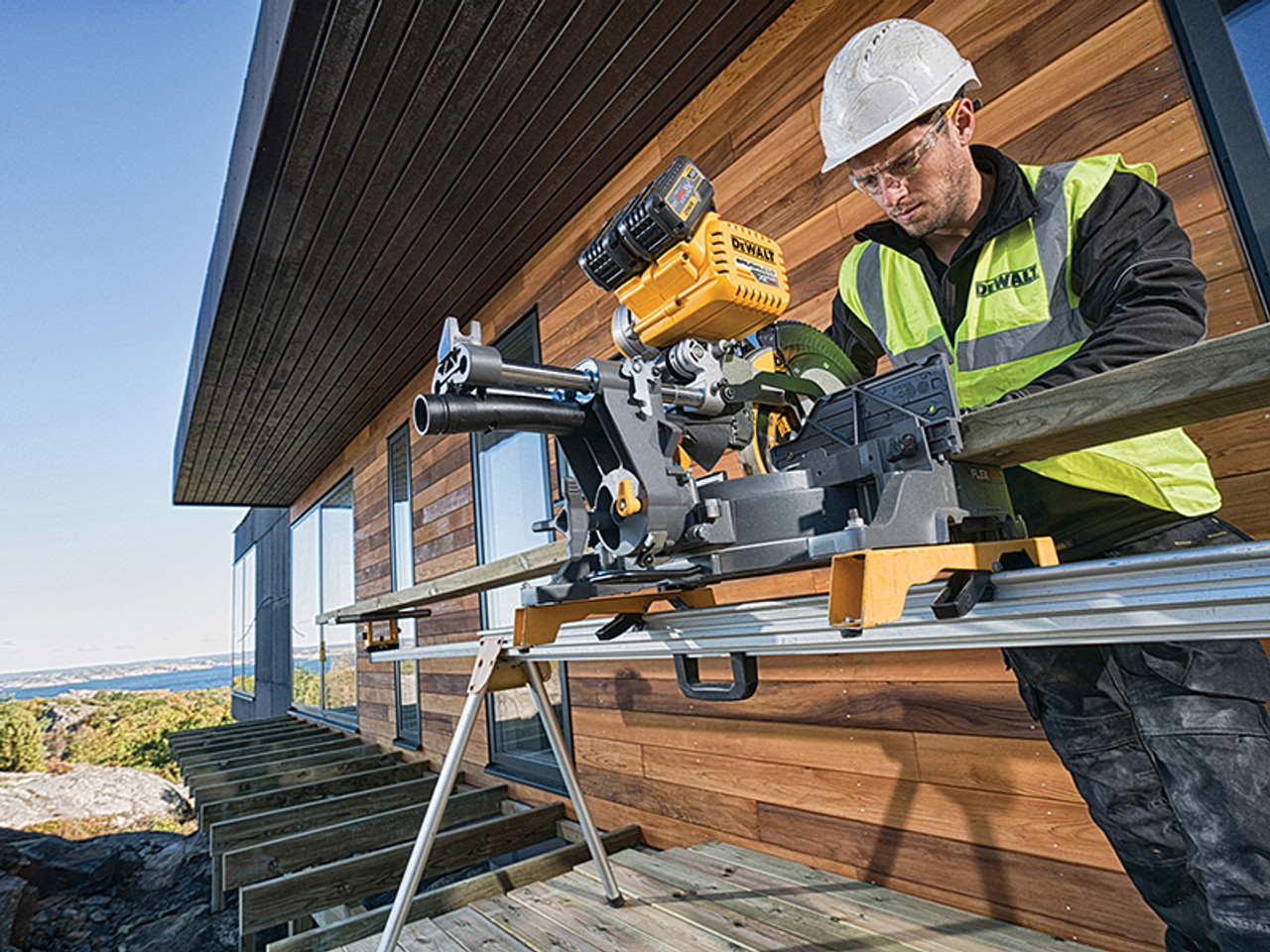 The DEWALT DHS780XR FlexVolt Mitre Saw has a brushless motor and hybrid drive with a compact design. It has been designed for large-volume use and even has a dust-proof trombone cut-out for the machining of larger work pieces. The high-quality bearing guide rollers ensure a comfortable and precise cutting guide with an expanded cutting capacity of up to 330 x 58mm.