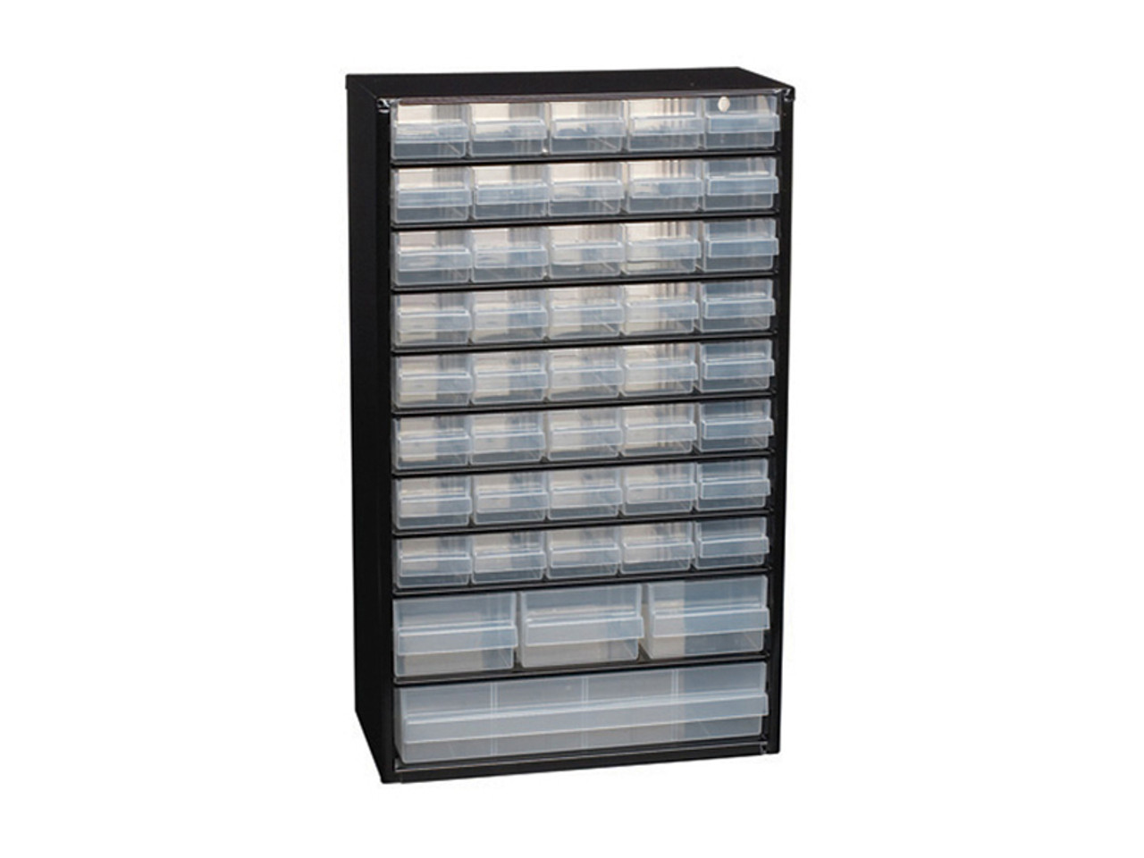 The Raaco C11-44 Metal Cabinet has 44 drawers, which can be sub-divided. The cabinet is made of painted steel and the drawers are made of polypropylene (PP). The cabinet can stand alone or be hung on a wall.