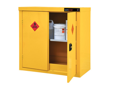 Supplied with 1 spill retaining galvanised shelf, liquid-tight sump to contain spillages, flush handles with two-point locking, reinforced doors, powder coated paint finish and relevant warning signs.